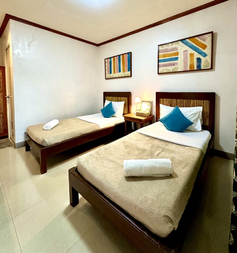Our triple rooms have a queen-sized bed and a single bed and can accommodate up to three people. It’s perfect for families or a group of friends wishing to take the sights of Kalibo in or getting ready for a trip to Boracay or the surrounding areas. It comes with a TV with cable subscription, air conditioning and a hot/cold shower within the ensuite bathroom.