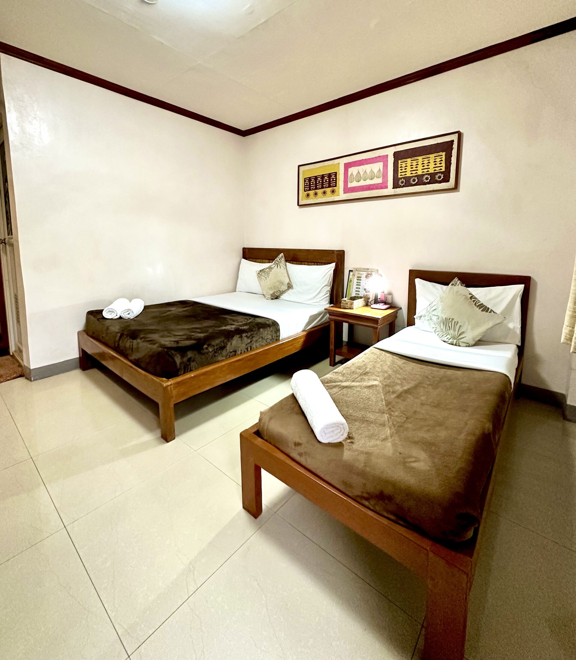 Our triple rooms have a queen-sized bed and a single bed and can accommodate up to three people. It’s perfect for families or a group of friends wishing to take the sights of Kalibo in or getting ready for a trip to Boracay or the surrounding areas. It comes with a TV with cable subscription, air conditioning and a hot/cold shower within the ensuite bathroom.